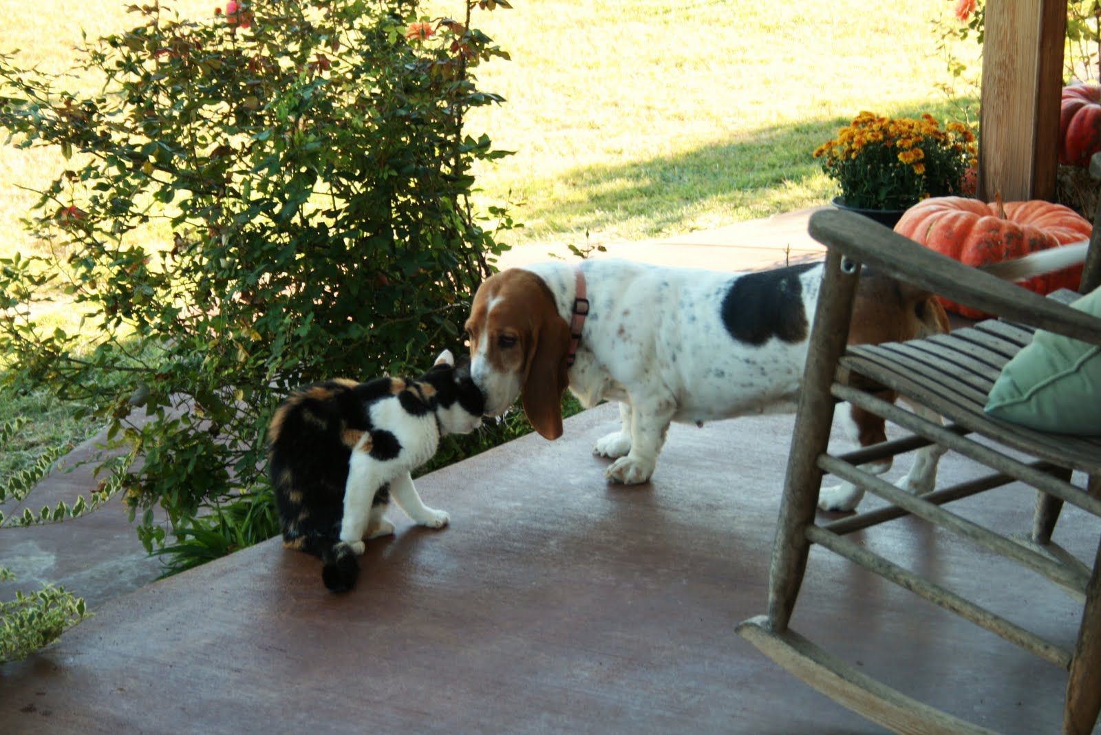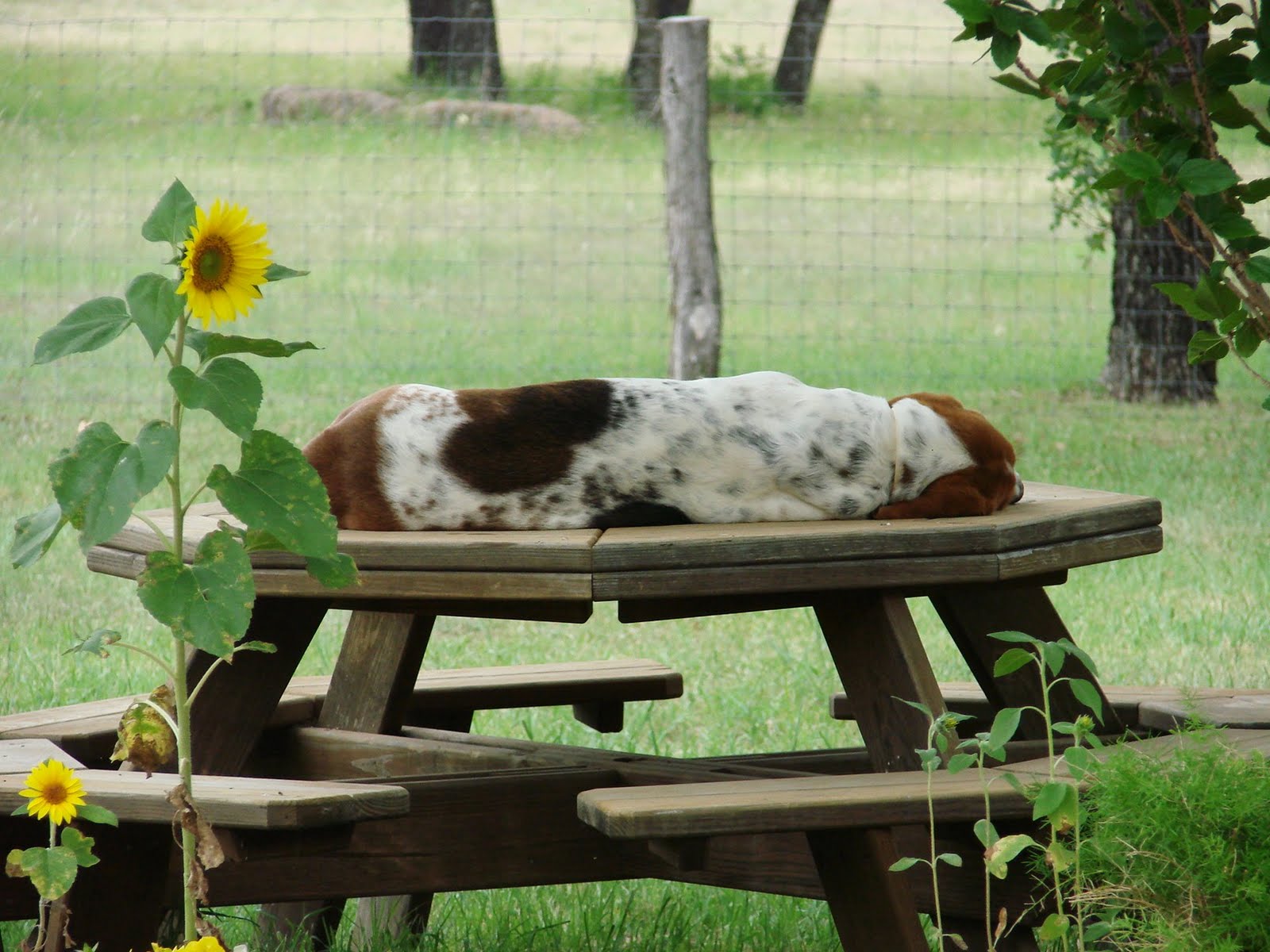 Since I don’t have any artwork to show you right now, I’ll tell you about Ladybird. We live about 3o miles out in the country and as I was driving home late one night last fall, I could vaguely see something in the road ahead. I slowed down and as I passed by, two big, brown eyes looked right at me through the car window. I pulled over and got out, but couldn’t see anything. Before I knew it, this big Bassett hound had jumped into the driver’s seat of my car and wouldn’t budge. I tried to get her out to put her in the back seat, but she was NOT getting out. She was very upset…crying! There were no houses nearby and it was too late to knock on doors anyway, so I shoved (heaved) her over to the passenger seat and did what I always do…..I took her home. The next day, I ran an ad in the paper, but no one ever called to claim her. It was pretty obvious that she had been dumped, not an uncommon thing out here, sadly.
