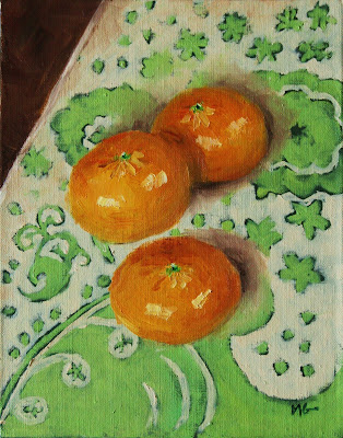 Oh, my goodness. What was I thinking choosing this busy background? Not a good idea for what is supposed to be a quick painting. By the time I got to the mandarins, I was ready to be done. But, they looked so pretty on this tea towel. And pretty always wins. Tomorrow’s painting will be much simpler.