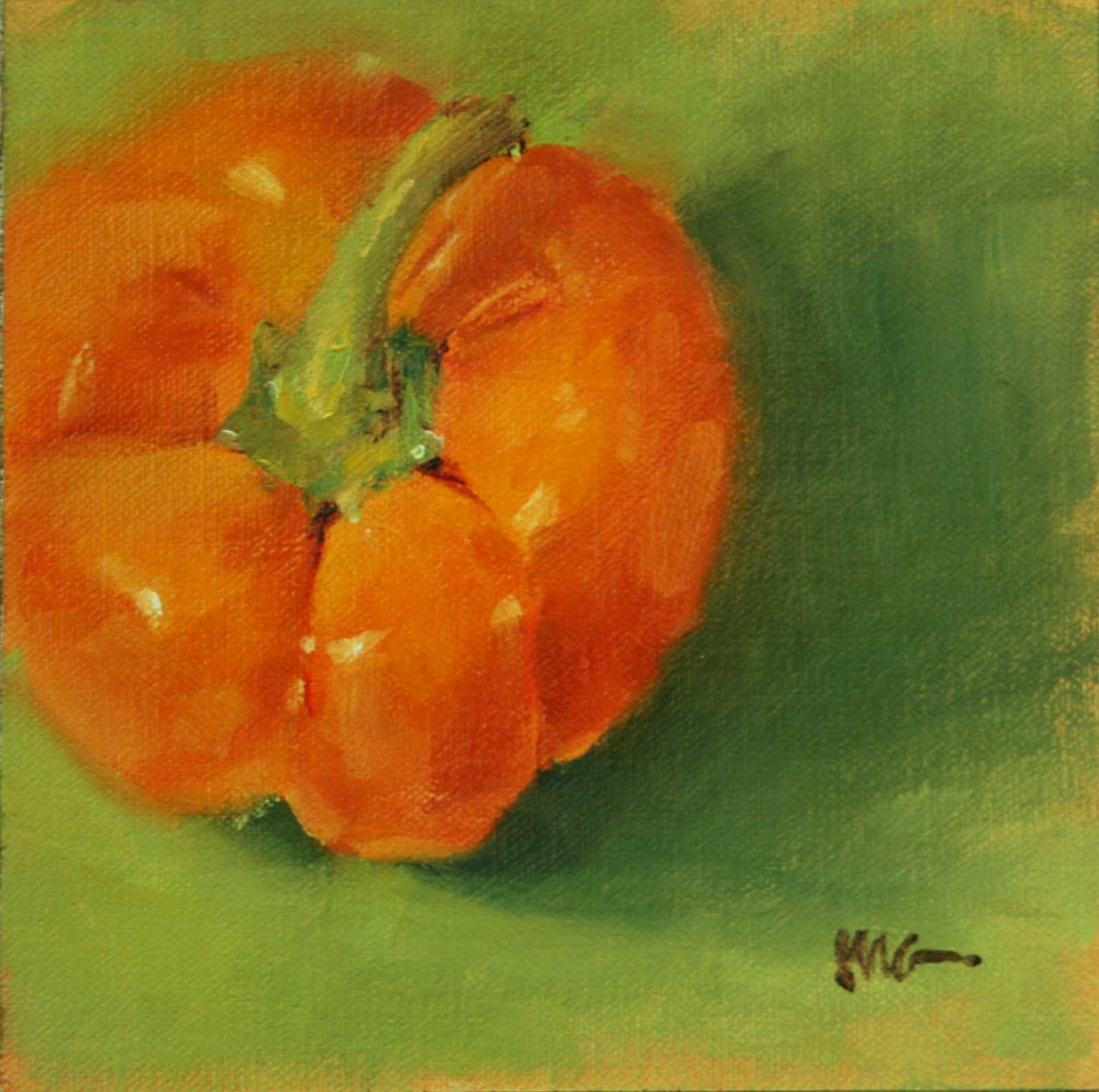 Roxanne and I are challenging each other to paint everyday. We’ve done pretty well so far. The first day, I painted this and texted it to her, calling it ‘Not a Pumpkin.’ She texted her painting back to me and called it, ‘Not a Pepper.’ She had painted a pumpkin! Neither of us had any idea what the other was painting that day. So funny!
