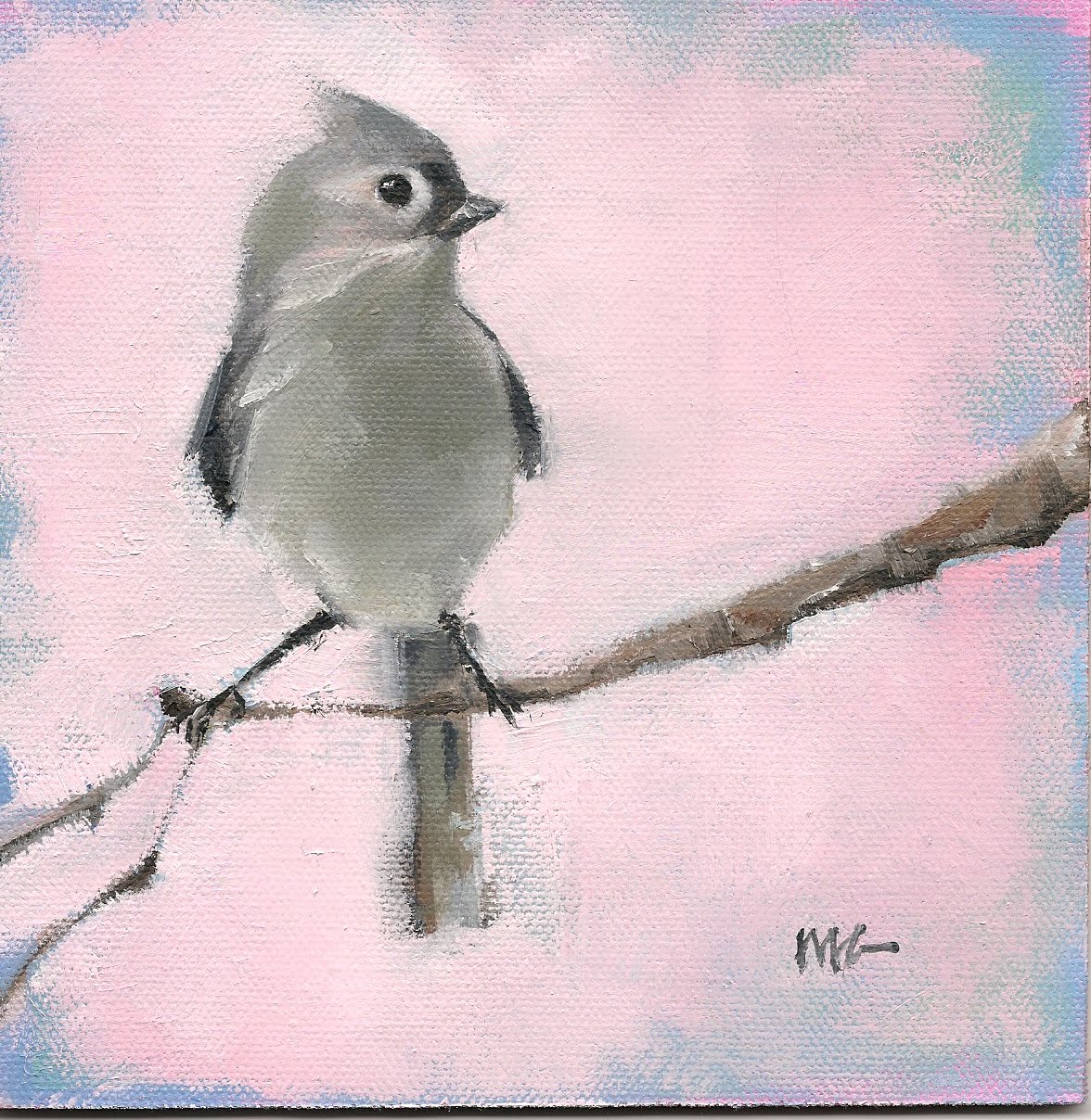 I am feeling pretty smart right now. My paintings are small enough that I can scan them – I don’t have to photograph and download them. Maybe I will post more often. I can see that I will need to crop the shadow in the future. I’m not sure I love the pink background. It was blue and I didn’t love that, either. Any suggestions? We have lots of these little birds at the feeders and they are so sweet with their big, bright eyes.