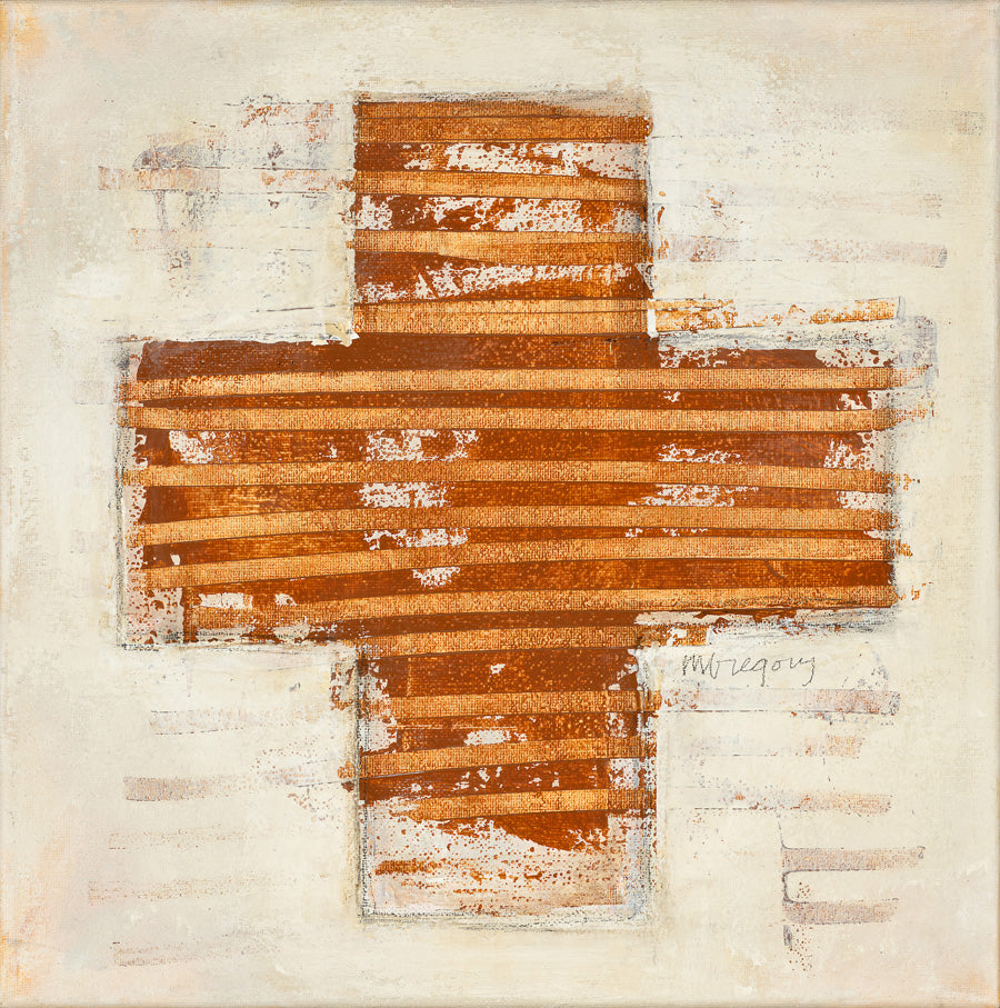 This canvas presents a Swiss cross in rich sienna tones, layered with expressive texture that captures light and shadow across its surface. The warm palette—ranging from deep rust to raw Sienna—creates an inviting yet contemplative mood. The textured application elevates the composition beyond graphic simplicity, revealing the artist's hand in every mark. Ideal for collectors drawn to work that merges geometric clarity with painterly sophistication.