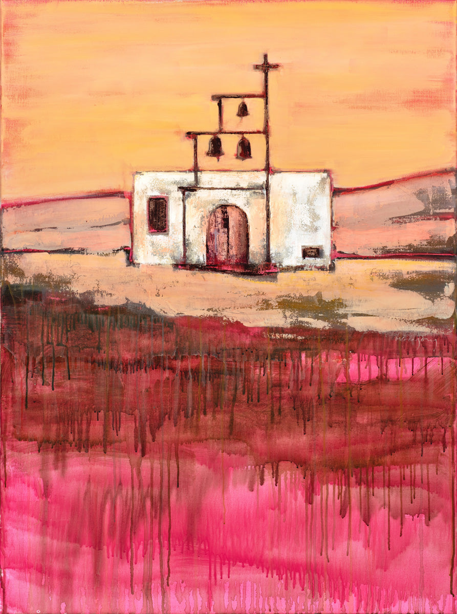 This reproduction of St Jude Thaddeus captures the spiritual essence of a New Mexico mission with impressionistic brushwork and luminous pink tones. This evocative painting renders the iconic adobe architecture against a warm, atmospheric background, emphasizing light and color over precise detail. The composition conveys the quiet reverence of these historic sacred spaces while celebrating the distinctive landscape and architectural character of the American Southwest. A contemplative piece for collectors drawn to regional American art and spiritual imagery.