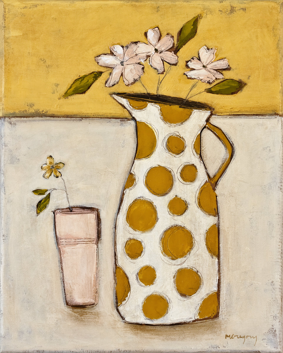 This still life scene with pitcher celebrates the charm of vintage tableware with its cheerful polka dot pattern rendered in mustard yellow against a creamy ground. The blush pink cup and flowers complete the happy scene.