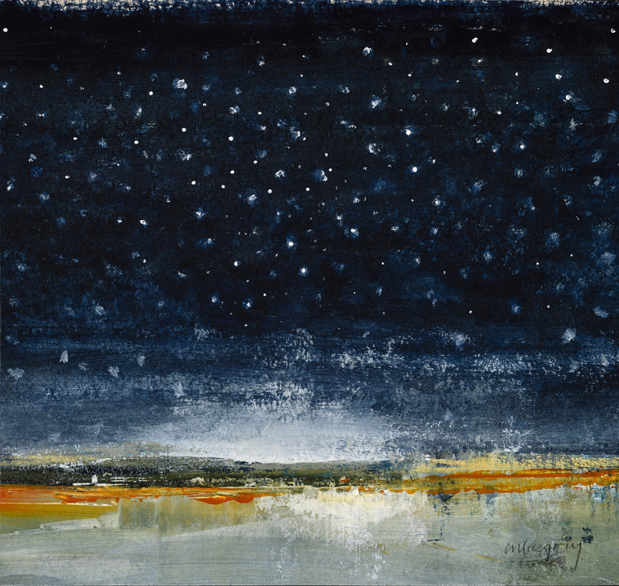I Wonder as I Wander captures the essence of quiet contemplation through impressionist technique. This landscape painting invites viewers into a moment of peaceful contemplation beneath a starry night sky, where soft brushstrokes and luminous tones create an atmosphere of wonder and solitude. The composition balances celestial elements with earthbound scenery, evoking the timeless human impulse to pause and reflect under the stars.