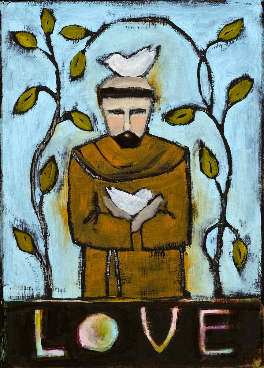 St. Francis lived a life of devotion and sacrifice for Jesus and embodied His example of peace and love. This piece captures that sacred essence—a meditation on divine compassion and our interconnectedness with nature. The imagery of the bird symbolizes freedom, grace, and the soul's communion with God, while the surrounding natural elements remind us that spirituality flourishes in harmony with the world around us. Perfect for those seeking daily inspiration or a meaningful gift for someone on a contemplative spiritual journey.