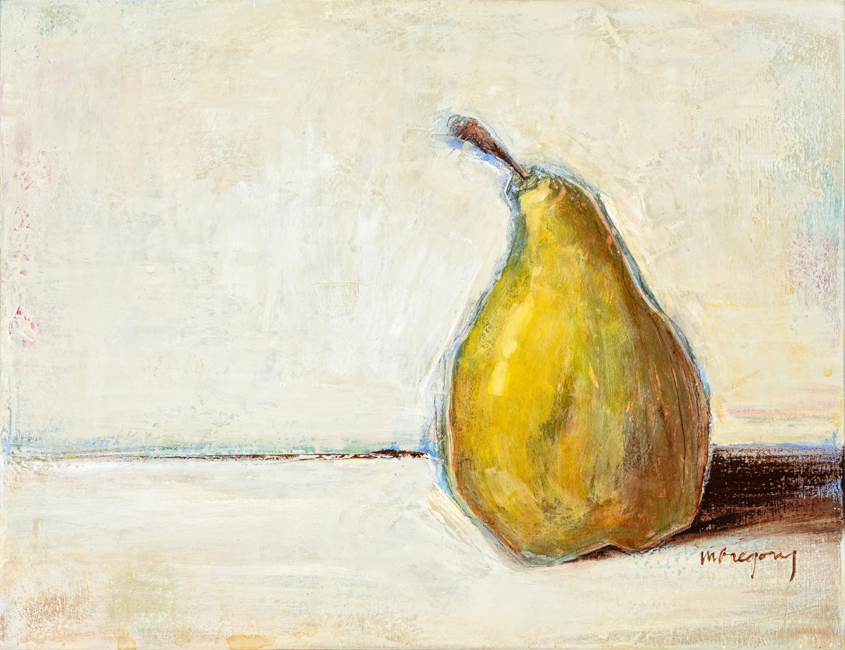 A serene study in simplicity, this green pear still life captures the quiet beauty of nature's geometry. Soft, understated tones and gentle composition create a peaceful visual meditation. An ideal choice for collectors who appreciate minimalist aesthetics and the timeless appeal of botanical subjects rendered with restraint and grace.