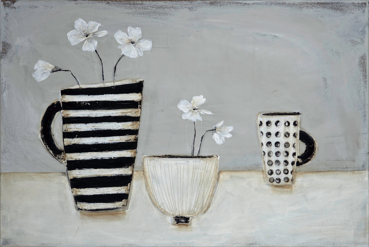 This striking still life composition captures a serene moment through carefully arranged monochromatic elements. A polka dot coffee cup sits alongside a striped pitcher and a bowl of fresh flowers, each piece contributing to a balanced, contemplative scene. The interplay of geometric patterns—dots and stripes—creates visual rhythm while the soft florals introduce organic warmth. Perfect for those seeking to infuse their space with understated elegance and peaceful sophistication. An ideal choice for art lovers who appreciate the timeless appeal of black and white and the calming presence of everyday objects.