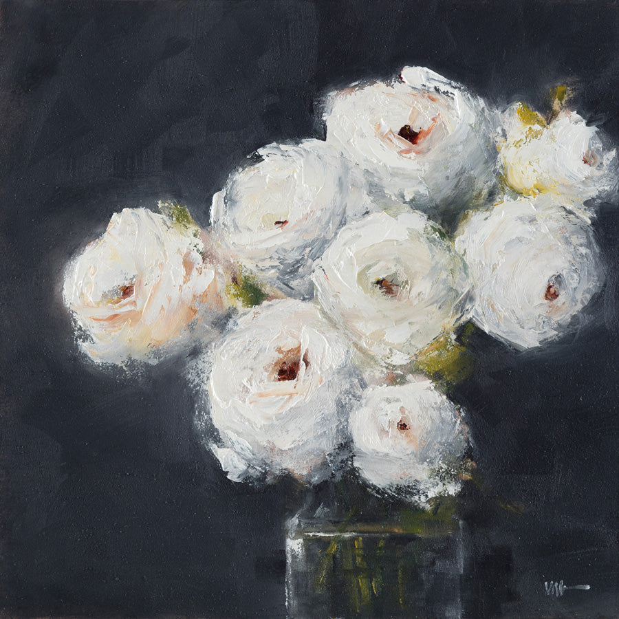Delicate white blooms rendered in soft, impressionistic brushstrokes create an understated elegance in this reproducing of an original oil painting. The glass vase and composition balances striking contrast through its monochromatic palette while maintaining a serene, contemplative quality. The loose, gestural technique captures the ephemeral nature of florals.
